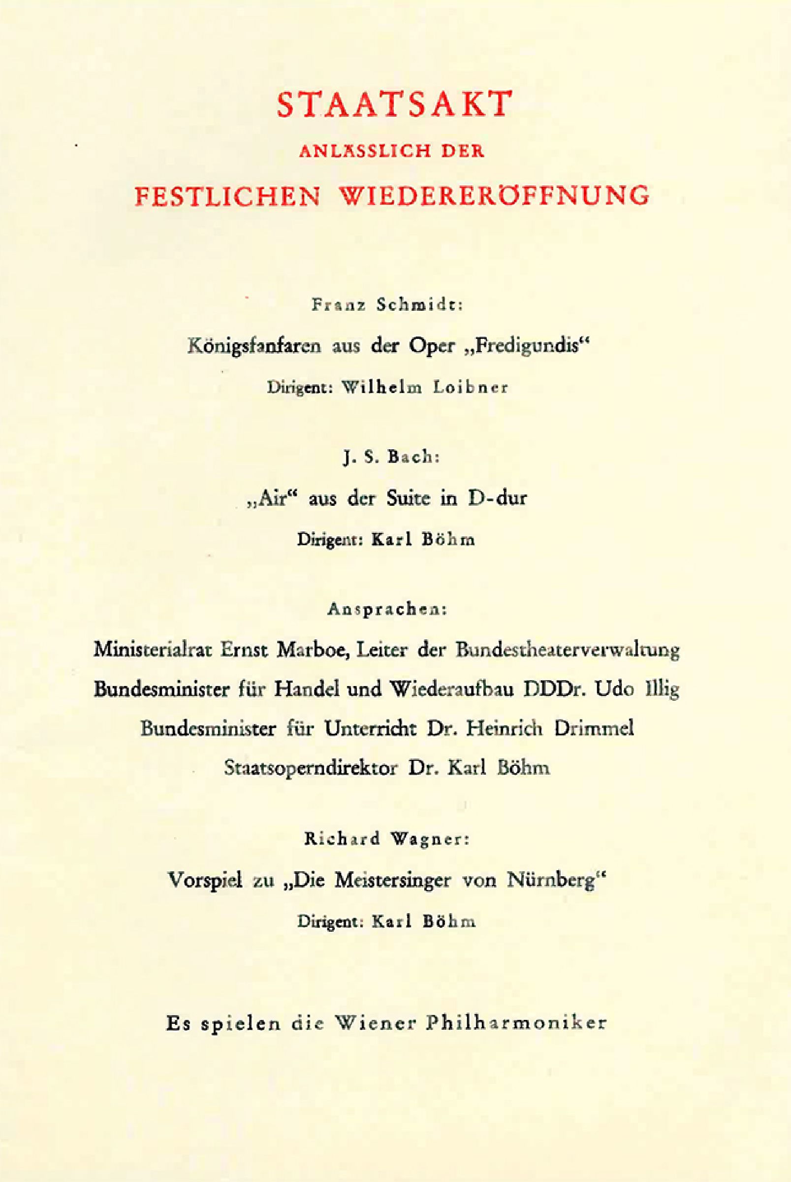 Noch bevor der zehn Jahre andauernde Wiederaufbau des Gebäudes im Jahr 1955 vollendet war, begann 1954 ein eigens durch das Bundesministerium für Unterricht eingerichtetes Komitee bereits mit den Vorbereitungen für die Wiederaufnahme des künstlerischen Betriebs. Ziel der Operndirektion war es, ein beispielloses Eröffnungsprogramm aus insgesamt acht Neuinszenierungen zu liefern und so aller Welt die „unverrückbare[n] staats- wie kulturpolitischen Grundsätze Oesterreichs“[2] zu veranschaulichen. Auf dem Programm standen unter anderem Mozarts Don Giovanni, Verdis Aida und Wagners Die Meistersinger von Nürnberg.