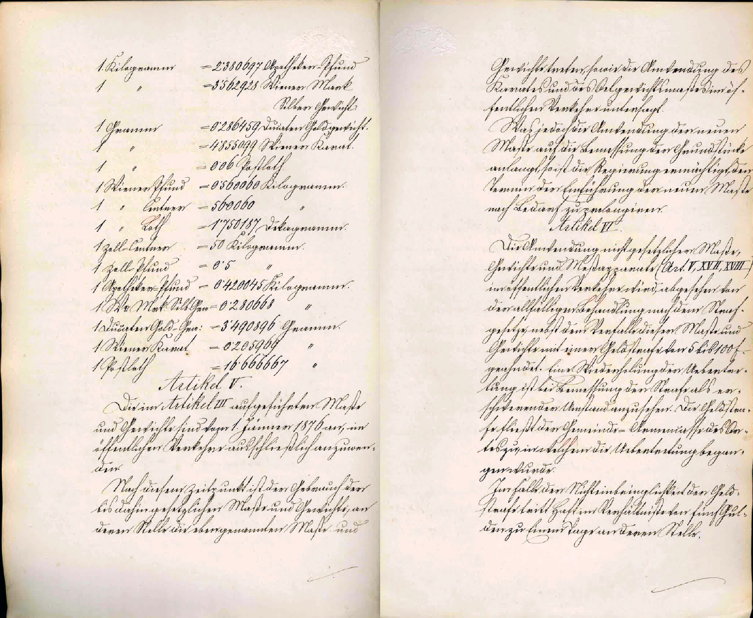 Die Einführung des neuen Maß- und Gewichtssystems erforderte gründliche Planungen und eine entsprechend lange Vorlaufzeit. Am 23. Juli 1871 wurde das Gesetz, das die ausschließliche Anwendung der neuen Maße und Gewichte ab 1. Jänner 1876 im öffentlichen Verkehr für die im Reichsrat vertretenen Königreiche und Länder (österreichische Reichshälfte) festlegte, von Kaiser Franz Joseph sanktioniert. Bereits ab 1. Jänner 1873 konnte das neue System fakultativ verwendet werden. Meter, Kilogramm und Liter mit ihren Untereinheiten und Vielfachen waren nun die zu gebrauchenden Maß- und Gewichtseinheiten für alle Längen-, Flächen-, Gewichts- und Hohlmaße.